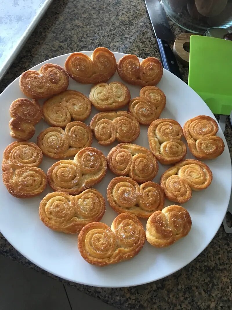 Для начала разморозьте слоеное тесто. Раскатайте его в ровный прямоугольник. Равномерно смажьте тесто 2-мя столовыми ложками растопленного сливочного масла. Равномерно высыпите половину сахара на тесто.