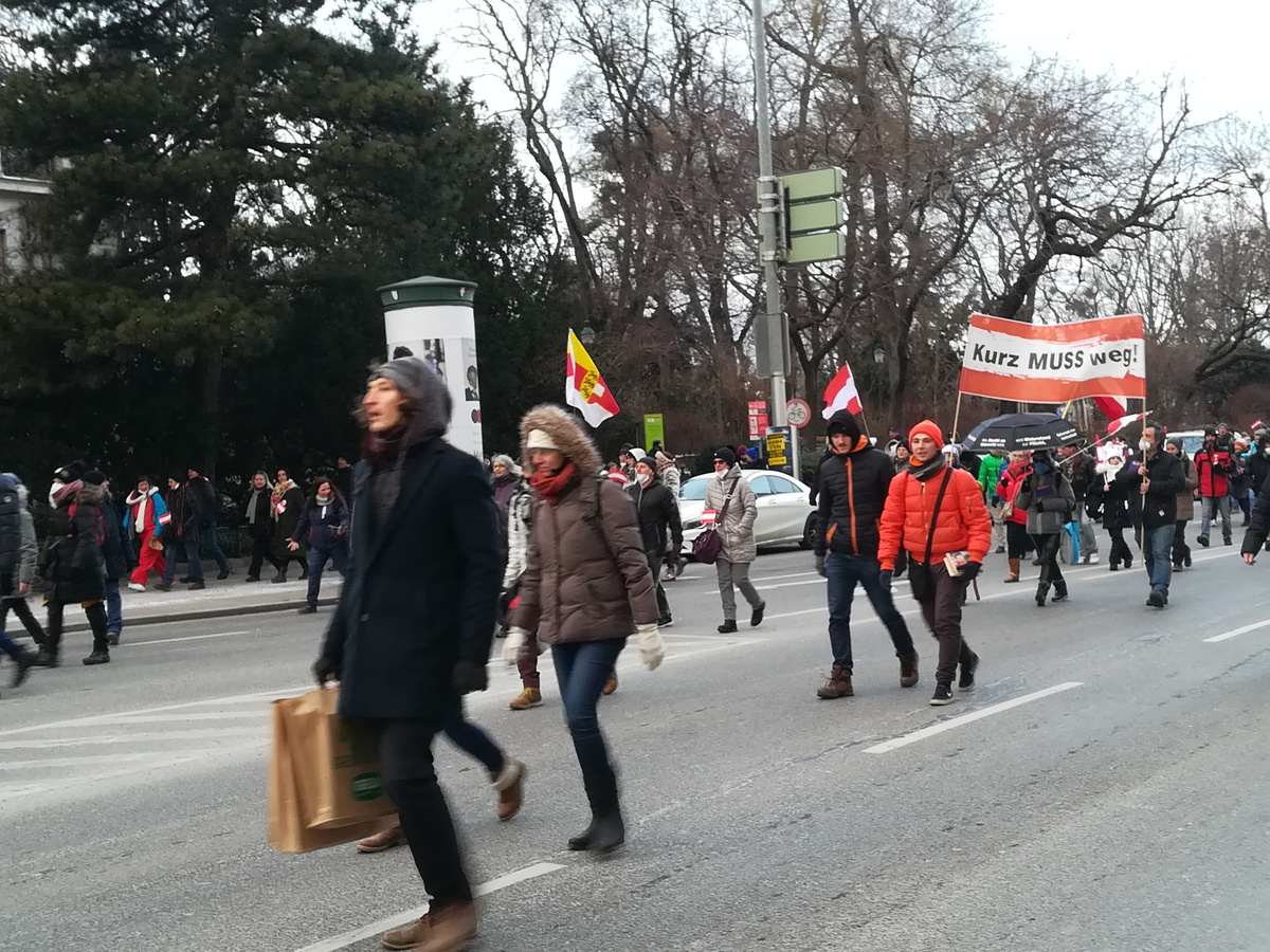 Я послушалась, повернула по направлению к электричке и у Интерконтиненталя поняла: в Вене проходит демонстрация против канцлера Себастьяна Курца, которого обвиняют в участии в коррупционном деле фирмы Новоматик, чей скандал уходит к делу Ибица вокруг Хайнц-Христиана Штрахе (я писала об этом деле с псевдо-русской псевдо-алигархой, почитайте). Дело Новоматик затрагивает сотни милллионов евро. Демонстранты требовали отставки канцлера. Демонстрация протянулась от Вин-Митте до Шварценбергплатц, это два км демонстрантов с флагами и плакатами, где полиция повернула ее назад к Интерконтиненталю, и проходила спокойно, без экстремов, демонстранты хотели дойти до Вест-вокзала, но их повернули назад.