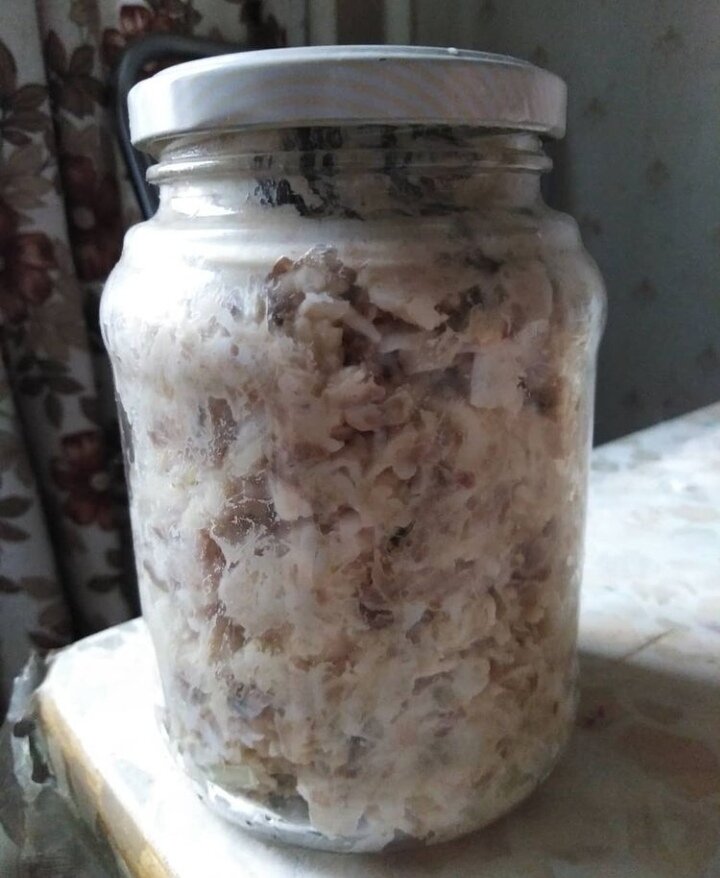 Селёдку чистим, отделяем полностью от костей. Нарезаем на мельчайших кубики, туда режем мелко лук, на мелкой тёрке натираем плавленый сырок, яйца, добавляем немножко майонеза и перемешиваем. Я убрала в банку, т.к. занимает меньше места в холодильнике. Очень вкусно!!!!