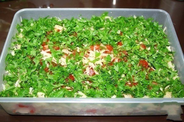 Всё нарезаем кубиками и выкладываем слоями: