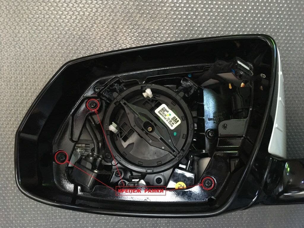 Для начало зеркальный элемент полностью наклонить в наружу и с помощью отвертки и куском тряпки поддеть зеркало. Аккуратно снять фишку с нагревательного элемента. Дальше откроется доступ к винтам саморезам. Всем удачи