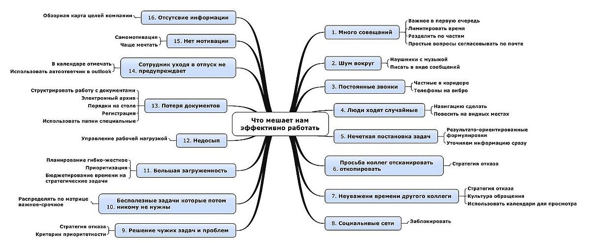 Вот пришли вы на работу, а там: совещания планерки, проекты, встречи, переговоры, презентации и тд. Используя карты все это можно организовать гораздо быстрей проще и эффективней. Применив соответствующие шаблоны можно быстро писать отчеты и готовить презентации, планировать встречи и вести проекты. Карты, созданные в MindManager легко экспортируются в Word, PDF, PowerPoint, Excell, MSProject, Visio, картинки и даже web-страницы! Информация в картах выглядит наглядно, понятно и легче воспринимается. Хотите проверить? Пожалуйста! В начале статьи вы видели карту «Что нам мешает эффективно работать». Посмотрите на нее еще раз, а затем посмотрите на текст ниже. «Что нам мешает эффективно работать» 1. Много совещаний. Важное в первую очередь. Лимитировать время. Разделить по частям. Простые вопросы согласовывать по почте. 2. Шум вокруг. Наушники с музыкой. Писать виде сообщений. 3. Постоянные звонки. Частные в коридоре. Телефоны на вибро. 4. Люди ходят случайные. Навигацию сделать, Повесить на видных местах. 5 Нечеткая постановка задач. Результато-ориентированные формулировки. Уточняем информацию сразу. 6 Просьба коллег отсканировать, откопировать. Стратегия отказа. 7 неуважение времени другого коллеги. Стратегия отказа. Культура обращения. Использовать календари для просмотра. 8 Социальные сети. Заблокировать. 9 Решение чужих задач и проблем. Стратегия отказа. Критерии приоритетности. 10 Бесполезные задачи, которые потом никому не нужны. Распределять по матрице важное-срочное. 11 Большая загруженность. Планирование гибкое-жесткое. Приоретизация. Бюджетирование времени на стратегические задачи.12 Недосып. Управление рабочей нагрузкой. 13 Потеря документов. Структурировать работу с документами. Электронный архив. Порядок на столе. Регистрация. Использование папки специальные. 14 Сотрудник уходит в отпуск не предупреждает. В календаре отмечать. Использовать автоответчик outlook. Нет мотивации. Самомотивация. Чаще мечтать. 16 Отсутствие информации. Обзорная карта целей компании. Посмотрели? А теперь скажите, где информация воспринимается быстрей и проще? Информация в обоих местах одинаковая, но один способ подачи помогает мозгу работать, а другой нет.