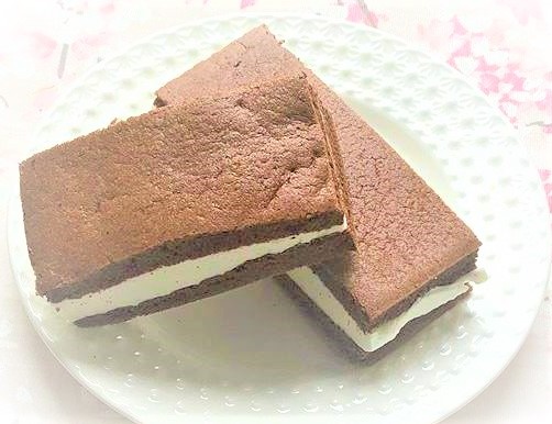 3. Поверхность мусса прикрываем второй половинкой бисквита, тщательно её прижимаем. Сформированный «Молочный ломтик» прикрываем сверху бумагой или плёнкой и отправляем в холодильник на пару часов.
