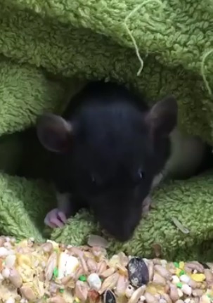 Знакомьтесь, это наша домашняя крыса дамбо. Домашние декоративные крысы хорошо поддаются дрессировке и очень умные. Крысы едят практически любую еду, но рацион крысы должен быть хорошо подобран хозяевами и давать на корм всё подряд нельзя. Клетка для крысы должна быть просторная, желательно в несколько ярусов.
