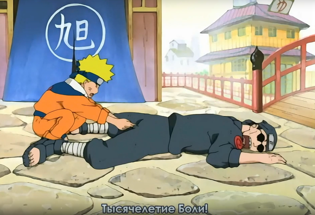 Эбису валяется без сознания и у нас очередная серия, где множество филлерных вставок и адаптаций. Вероятно, персонаж был крайне неприятен студии, рисовавшей аниме(либо они просто решили разбавить происходящее шутками) - но Наруто проверяет уровень отключки Эбису четырьмя пальцами, засаженными в... сенсеня. Ну или, другими словами, использует технику Тысячелетие Боли, которую использовал на нём Какаши ранее.
