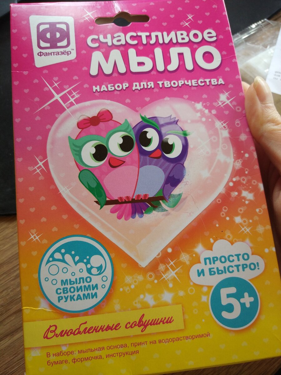 Очень понравились милые совушки на картинке, до этого ни разу не пробовали делать мыло. Открыли, достали всё, что было внутри:
