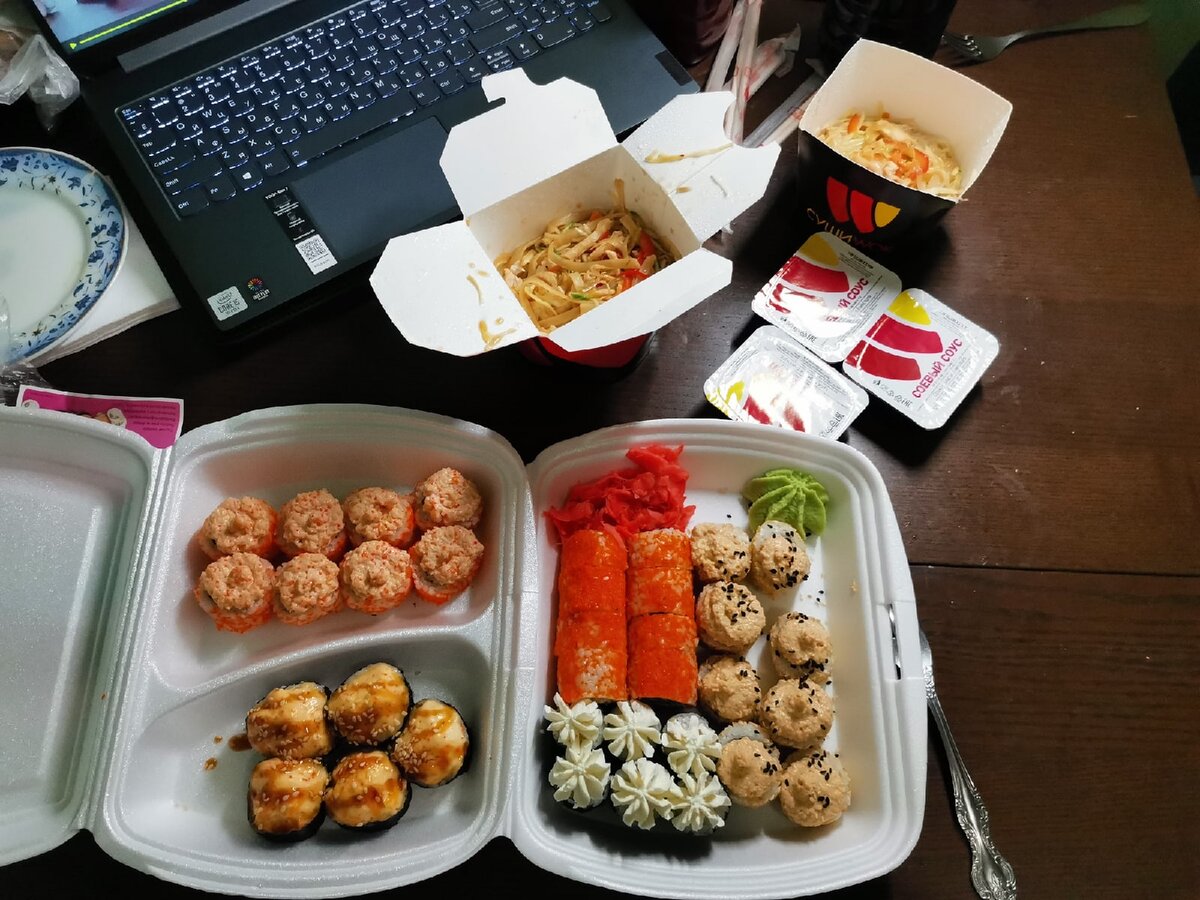 И мы кто куда, кто-то в фастфуды, кто-то шаурма, а я в этом месяце побаловал себя ролами и лапшой вок.