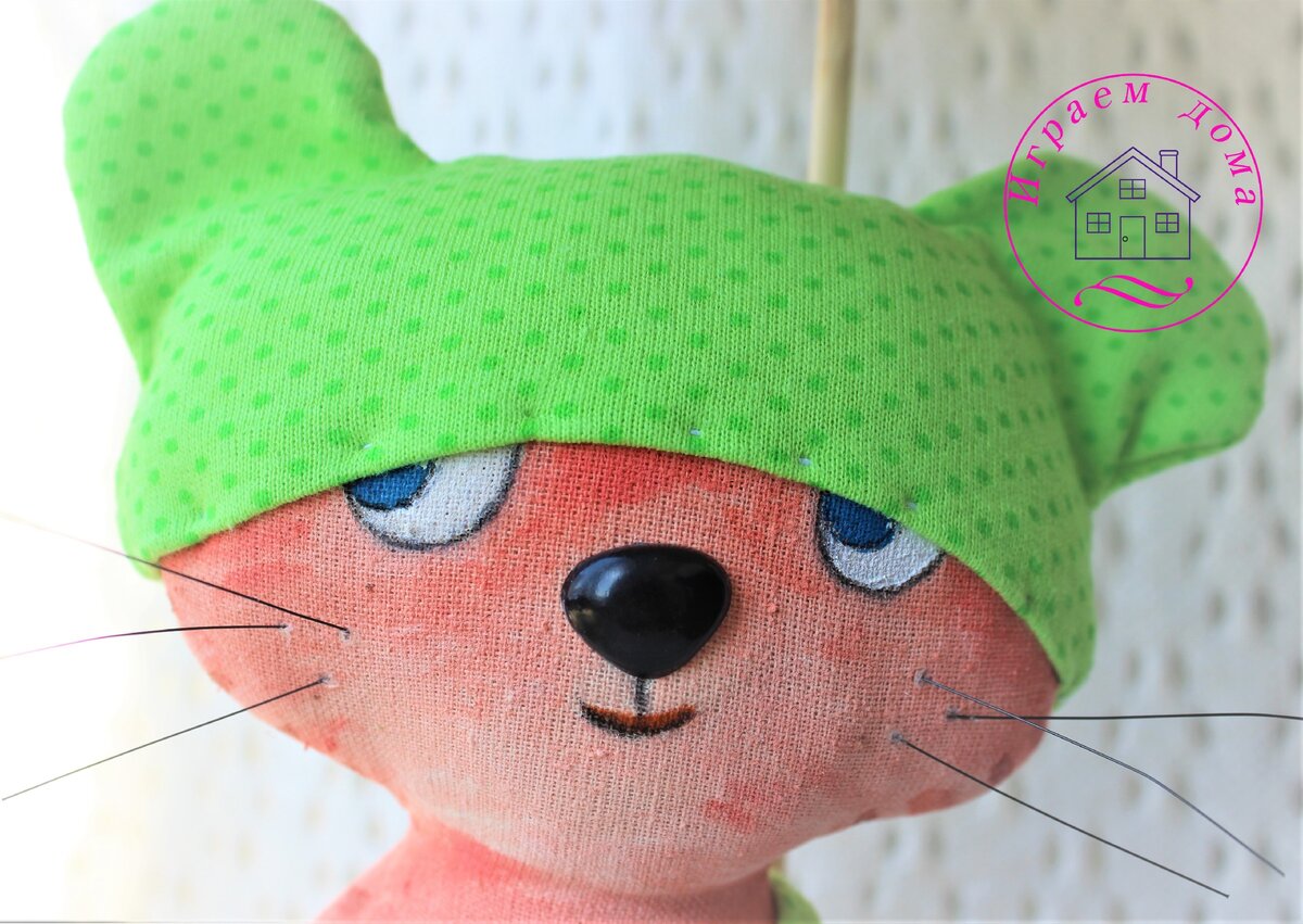 Лапки котика приклеиваем к подставке, а голову с помощью тонкой проволоки (или можно пришить) фиксируем на палочке от зонтика.