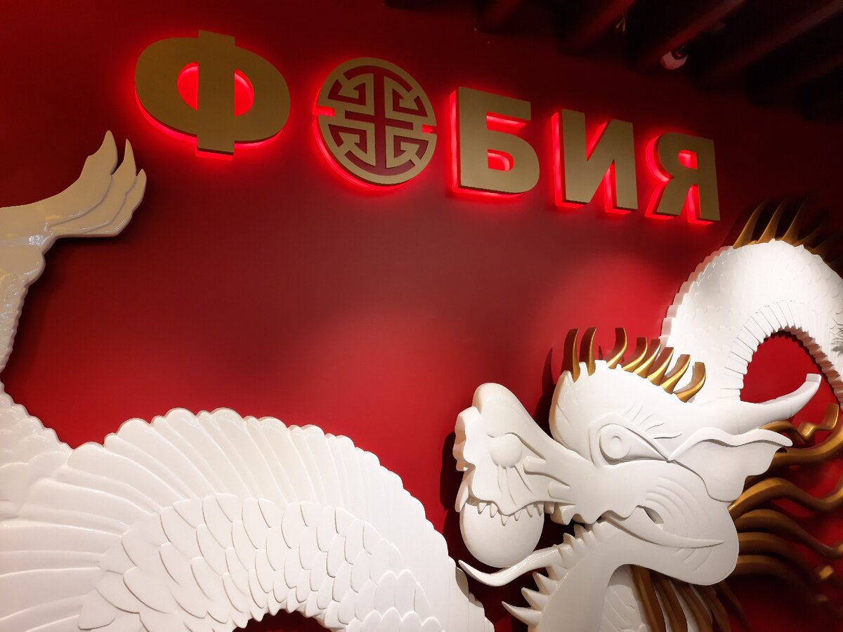 Но нет, типичный корнер в закутке шумного фудкорта: теснота, суматоха, столпотворение подносов на столах, музыка из колонок, которые — такое чувство — направлены прямо на «Фобию». Разве что золотогривый вьетнамский дракон на стене: ни у кого такого нет.