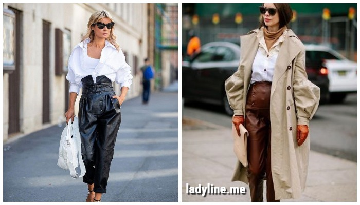 Дерзкие и сексуальные кожаные брюки также удачно можно комбинировать с женственными и элегантными моделями блуз, актуальными клатчами и туфлями на каблуке.