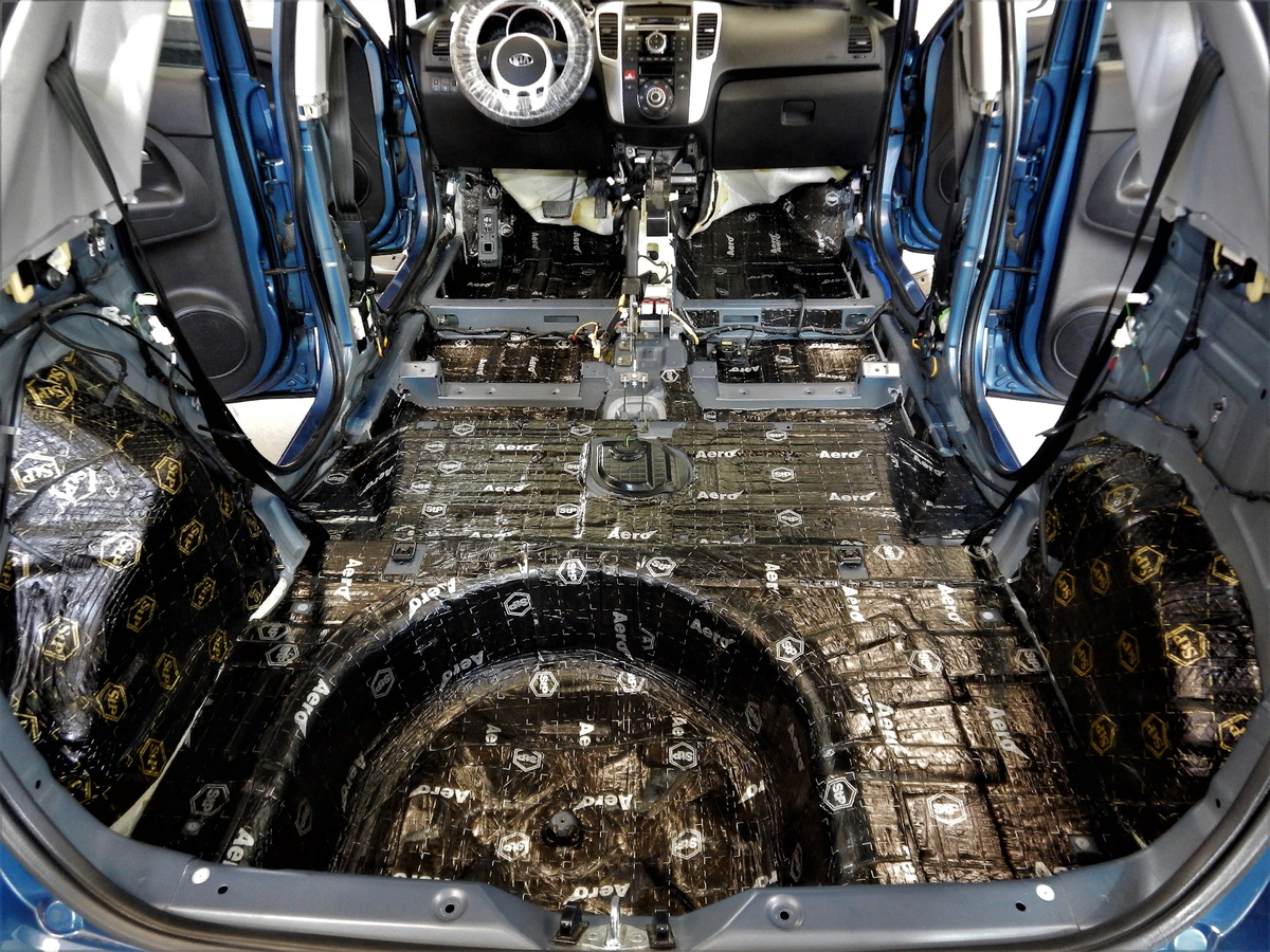 Виброизоляция. Технология направлена на устранение шума, возникающего при тряске агрегатов и различных деталей машины. Для поглощения вибрации используют специальные пластины с клеевым слоем. Энергия тряски переходит в нагрев изолятора и выходит в окружающую среду в виде тепла. Виброизоляция особенно необходима, если планируется поставить в автомобиль мощную акустическую систему.
