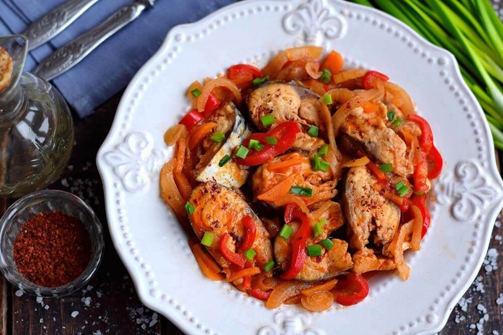 Скумбрия — рыба с довольно оригинальным выраженным вкусом и запахом. Существуют ряд рецептов, в которых вкус этой рыбы немного приглушается. Например, можно приготовить скумбрию с овощами в томате. Во время тушения рыба впитывает в себя вкус и запах овощей и томатной подливы, что немного приглушает ее натуральный вкус. В качестве овощей достаточно использовать три компонента — репчатый лук, морковь и сладкий перец. Рыба тушится кусочками для удобства в употреблении, небольшое количество времени. Скумбрия в томате отлично подойдет к любому гарниру, при этом не нужно дополнять его овощами.
