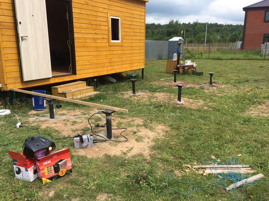 Поэтому в следующем дачном сезоне мы решили пристроить к бытовке веранду на свайном фундаменте 3x6м2.