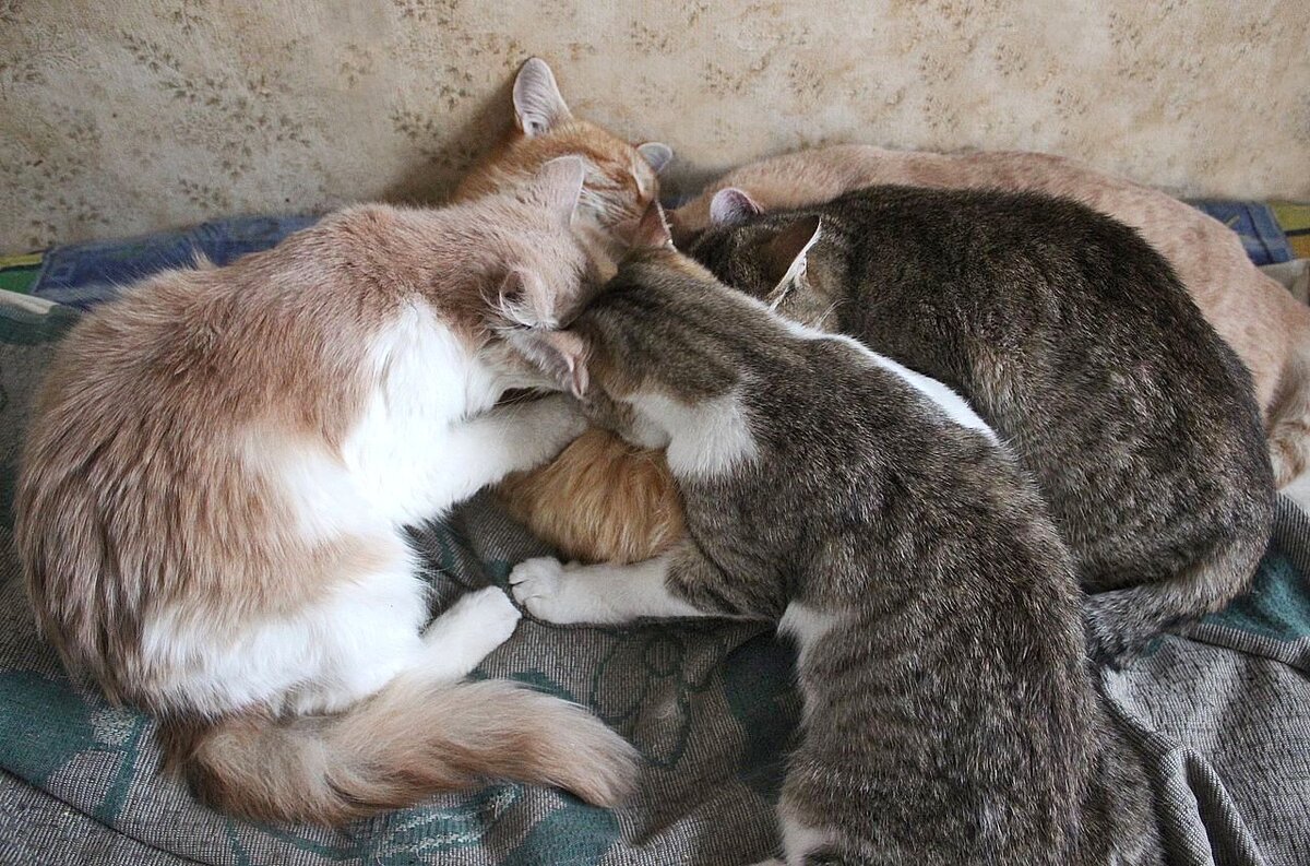 Рыжий развалился на кровати, а к его сиськам пристроились несколько котят. Аппетитно так причмокивают-посасывают. Эту картину можно видеть вот уже