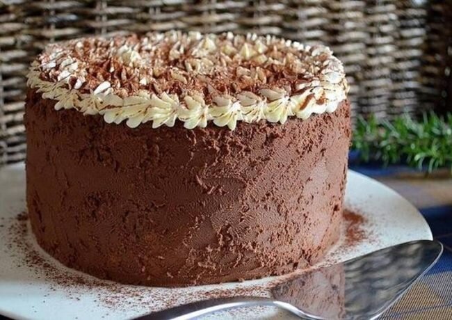 Шаг 9. Украшаем торт. Снимаем каркас. Бока десерта смазываем взбитым шоколадным кремом, а его поверхность украшаем из кондитерского мешка оставшимся сливочно-сырным кремом и посыпаем тонким слоем какао-порошка. Торт помещаем в холодильник для пропитки на несколько часов.