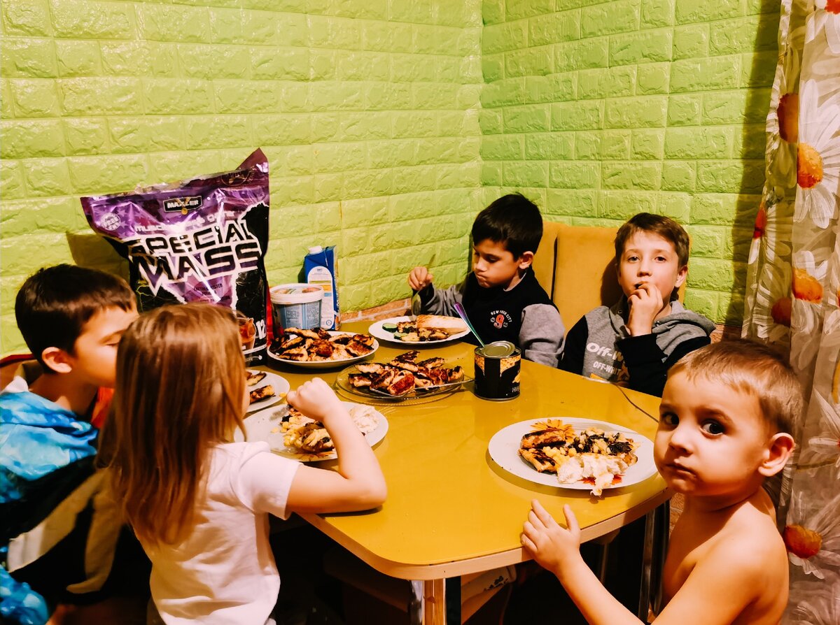 Ваня тарелки на всех расставил, всем по 2 кусочка мяса выделил, разложил овощи, лепешку, отнёс тарелку бабушке с ужином и только после этого всем разрешил на кухню заходить, за стол усаживаться.