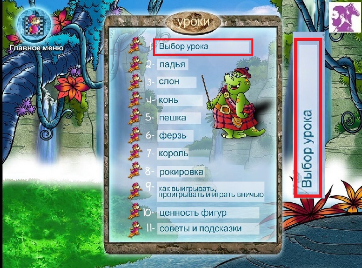 Общее замечание: авторы Программы в открывающемся окне «Выбор урока», что просто неверно, в самой первой кнопке красной «ленты прогресса», как они сами назвали этот комплекс элементов, постарались сконцентрировано изложить массу важных сведений о доске, и начальной расстановке фигур. Надпись «Выбор урока» следовало расположить выше оглавления. Признаюсь честно, я чуть ли не год даже не догадывался кликнуть на этом «занятии». Вместо этого под пунктом номер один надо было указать что-нибудь вроде «Вступление», или «Доска и фигуры», «Общие сведения» или тому подобное.
