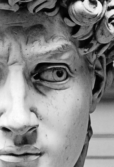 Микеланджело - это про СКРЫТОЕ ДВИЖЕНИЕ, про ДВИЖЕНИЕ ВНУТРИ, про момент ЗА СЕКУНДУ ДО - самый пик напряжения и концентрации (через секунду он рванет пращу, и камень со свистом полетит в Голиафа; брови Давида грозно нахмурены, ноздри разширены, глаза горят, напряжены мышцы шеи).
