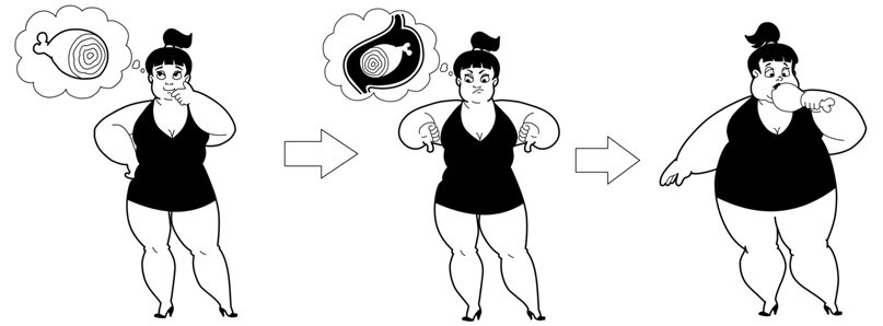 Вы будете удивлены, но стройные люди каждый раз перед тем, как положить еду в рот, мысленно представляют ее в желудке. Если от воображаемой пищи в желудке стало хотя бы на мгновение комфортнее, чем до этого кусочка, — это Голод. И стройный гражданин смело принимается уже за настоящую куриную ножку. Если воображаемая еда никак не отразилась на ощущениях в желудке, а то и вызвала легкий дискомфорт, то кусочек этот идет по Аппетиту, и стройный человек отодвинет еду в сторону. Самое замечательное, что им не приходится себя мучить и связывать себе руки, дабы удержаться от соблазна. Просто на телесном уровне они ощущают, что кусочек по Аппетиту (когда Голод уже спит) не доставит телу никакого удовольствия. Может, во рту и будет вкусненько, но желудок почувствует лишь тяжесть.