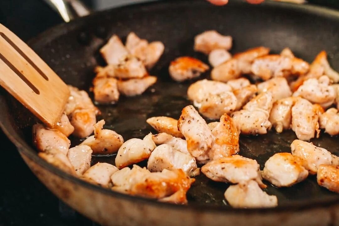 Курицу нарежьте на произвольные кусочки. Приправьте и обжарьте до корочки с каждой стороны. Отложите.