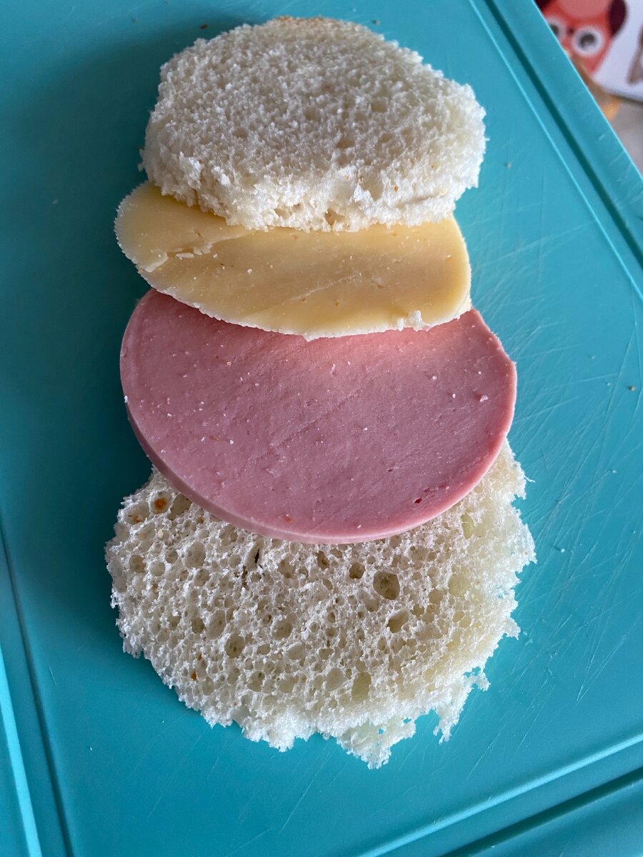 Нарезаем хлеб(у меня нарезной), колбасу, сыр и формируем как на бутерброд