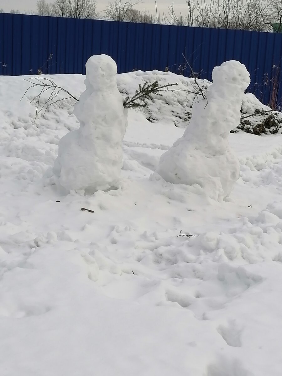 На прогулке. На фото снеговички, которых испугался отважный Арчи. Увидел, остановился, задумался, что это может быть. Непонятное, странное. А раз странное, лучше держаться поближе к хозяйке. И самому укрыться от возможной опасности, и ее укрыть.