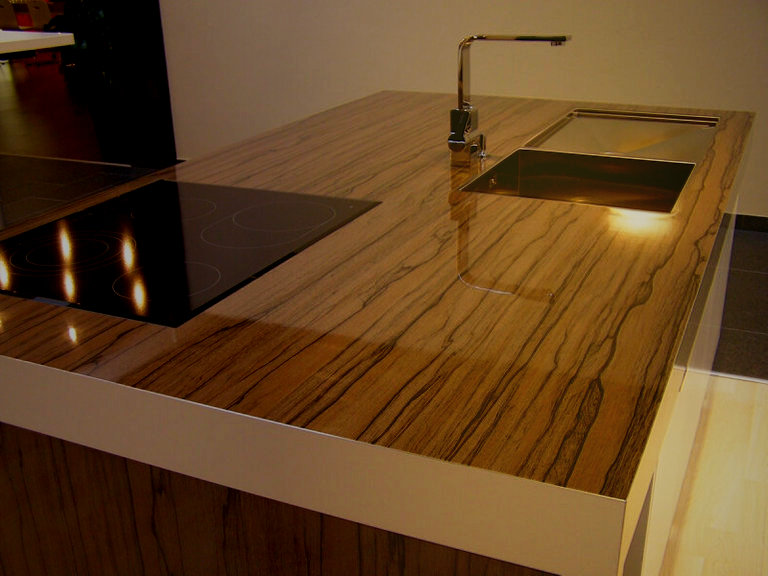 Такие столешницы преимущественно изготавливаются из гранита. Каждый из нас знает насколько прочен этот камень. Гранитные столешницы всегда привлекают внимания гостей потому что они абсолютно уникальны и не похожи ни на какую из других поверхностей. Из недостатков стоит выделить высокую цену и большой вес поэтому в большинстве случаев может потребоваться дополнительная опорная конструкция