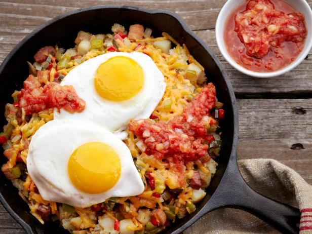 - Положите 5 картофельных долек поверх расплавленного сыра, затем сверху выложите по две яичницы на сковородку. Выложите сверху сальсу или пико-де-гальо и сразу же подавайте.