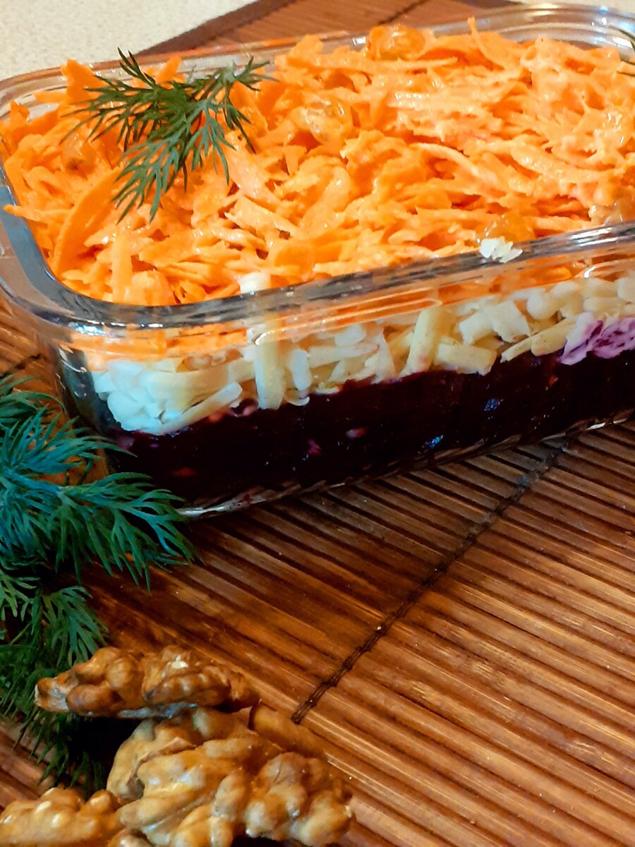 На мой взгляд, этот вкусный и простой в приготовлении салат из моркови и свеклы хороший вариант не только, как будничная закуска, но и замечательно будет смотреться на праздничном столе. Минимум майонеза в составе (салат слоеный) делает этот салат еще и полезным. Итак, рецепт, ингредиенты и процесс приготовления.