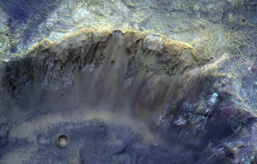 Светлые залежи, пояснили в Роскосмосе, указывают на выход коренных пород, которые могут содержать в себе древние глинистые минералы, сформировавшиеся в присутствии воды. "Кроме того, здесь также хорошо видны нанесенные ветром песчаные отложения, создающие "рябь" на дне кратера. Их характерный рыжевато-коричневый оттенок указывает на наличие оксидов железа", - добавили в госкорпорации.