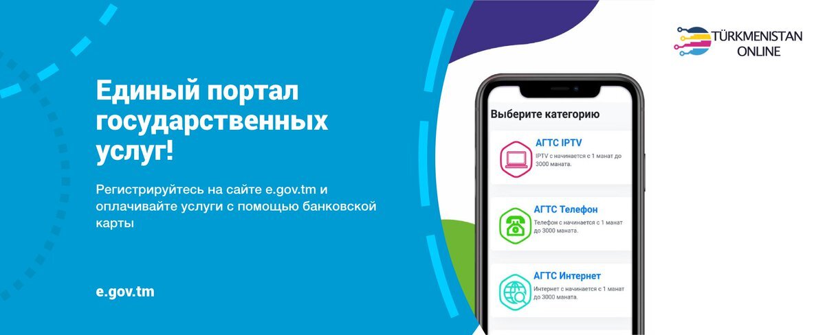В Туркменистане запущен Единый портал государственных услуг и функций. Сайт доступен на туркменском https://e.gov.tm/tm/ и русском языках https://e.gov.tm/ru/ Благодаря порталу население Туркменистана получит возможность в электронном виде узнавать и получать государственные и муниципальные услуги. В данный момент на портале есть возможность оплатить за услуги Интернета, городского и сотового