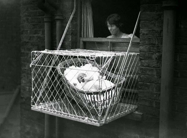 А вот лондонское общество — другое дело! В Англии клетки для малышей обрели бешеную популярность. В Лондоне 30-ых годов у каждой семьи с ребенком, которая не имела своего сада, было такое приспособление.