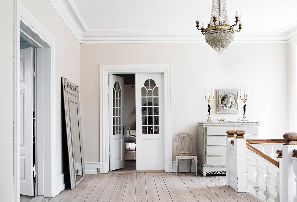 Еще раз посмотрим на заглавное фото, оно достойно внимания. Здесь хрустальная люстра создает гламурный контраст с тонированным деревянным полом, в то время как бледно-кремовый цвет стен делает комнату выразительной, а белоснежные молдинги и плинтусы ослепительно яркими.