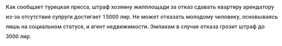 Арендодатели, внимание! Как недавно выяснилось, вас могут оштрафовать, если вы откажете в аренде одинокому мужчине, а он на вас пожалуется. Об этом заговорили после того как по ТВ прошло несколько сюжетов, что неженатым мужчинам довольно часто отказывают в аренде квартир, собственники предпочитают видеть в качестве арендаторов пары и если одиноких, то девушек, но никак не мужчин. Управление по правам человека и гендерному равенству Турции прокомментировали, что это дискриминация по половому признаку и она вполне себе наказуема реальными штрафами. Источник новости