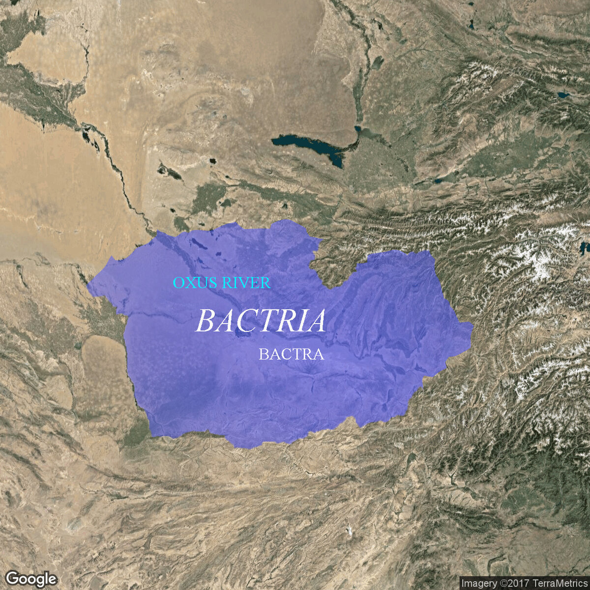 Территория древней Бактрии занимает Южный Узбекистан и Таджикистан, а также Северный Афганистан. Практически посередине этой обрасти протекает река Амударья, известная во времена Александра Македонского как Окс.
