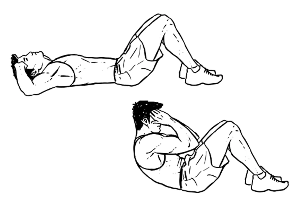 Первое упражнение. Подъём туловища. Принимаем положение лёжа на спине. Руки за головой в замок. Ноги согнуты в коленях. Поднимаем туловище и касаемся локтями бёдер и возвращаемся в исходное положение. Это упражнение выполняем 1 минуту.