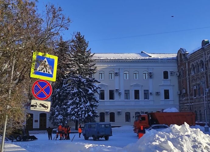 Проехать на саму площадь Карла Маркса с улицы Фокина (с проспекта Ленина и улицы Горького нельзя — стоят запрещающие знаки) проблематично. Много снега. Из-за него образовалась утрамбованная колея, «выскочить» из которой автомобилисты не могут. Едут в реверсном порядке, пропуская встречный поток.