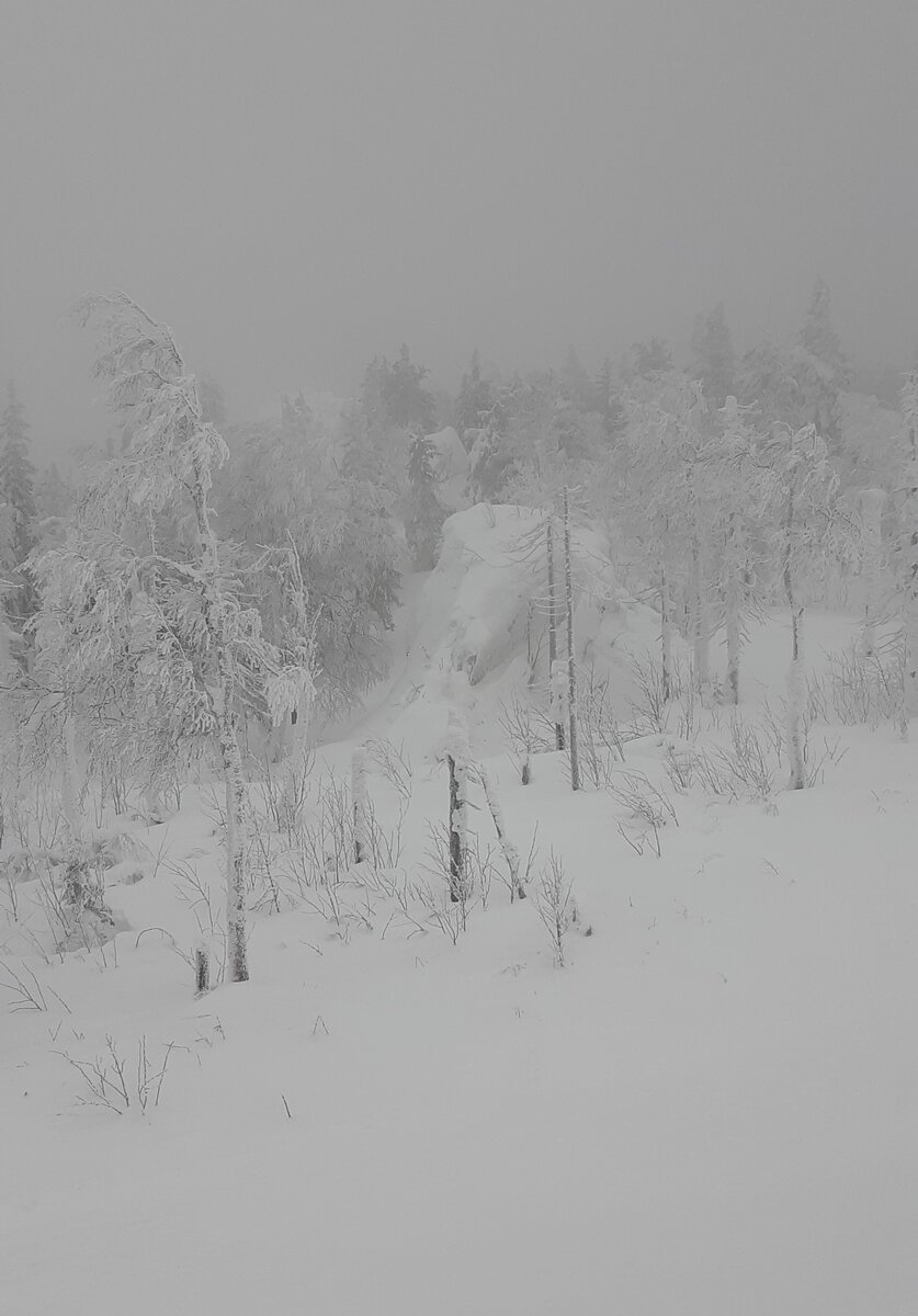 Поднимаясь все выше, снег сгущается. Деревьев становится все меньше.