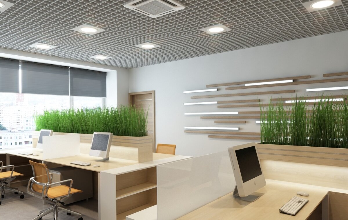 Также для повышения работоспособности сотрудников рекомендуется оформлять интерьер офисов зеленью. Это позволит улучшить микроклимат в интерьере, зонировать пространство, а также создать успокаивающую атмосферу.