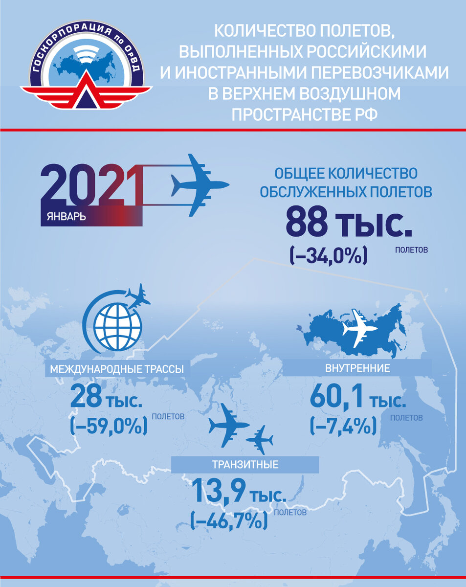В январе 2021 года российские авиадиспетчеры обслужили в верхнем воздушном пространстве страны 88 тыс. полётов, уменьшив этот показатель относительно того же периода прошлого года на 34 %.