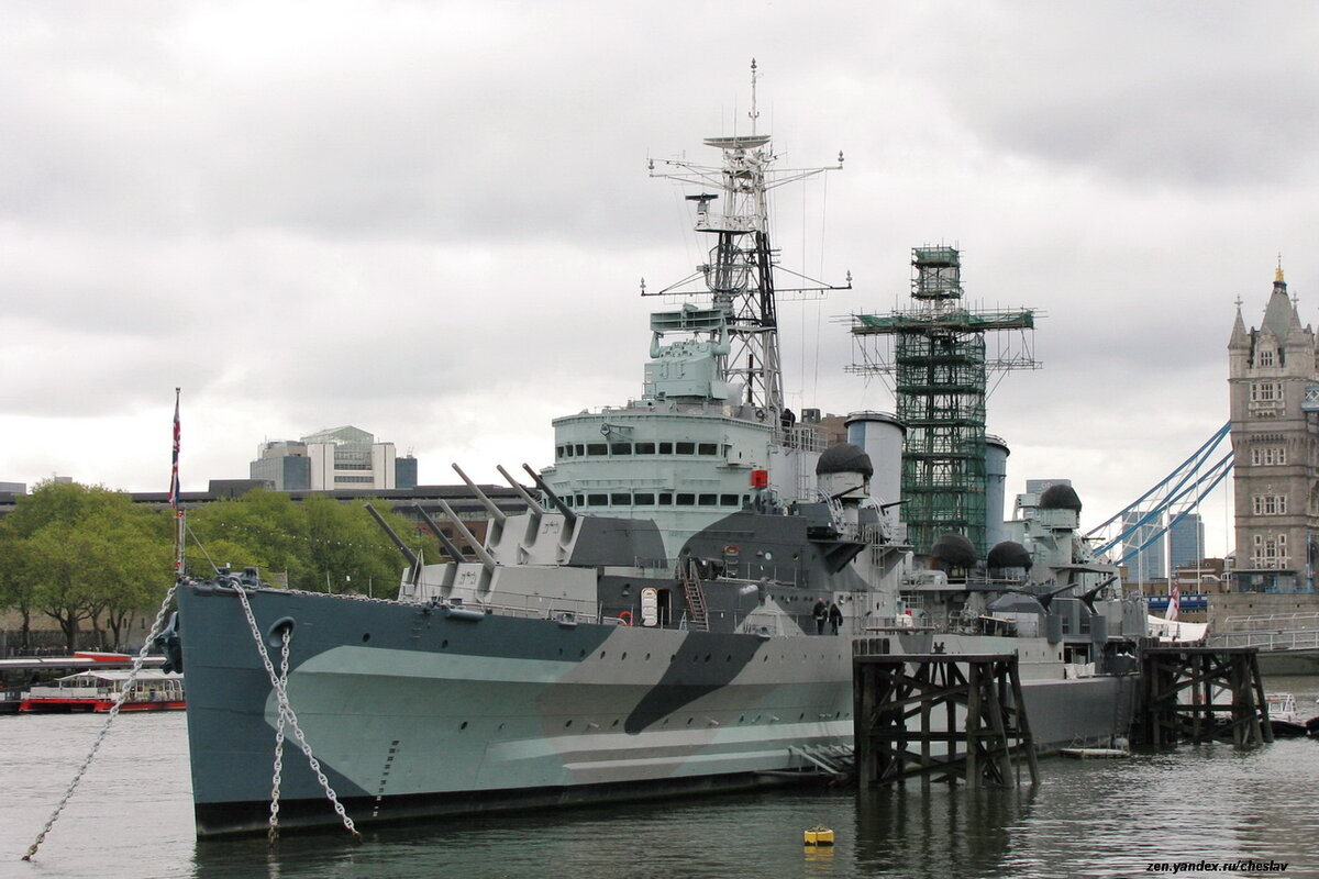 Легкий крейсер "Белфаст" - один из самых известных кораблей-музеев Великобритании. Он сегодня единственный сохранившийся английский надводный корабль (кроме катеров) - участник Второй мировой войны. Крейсер находится на вечной стоянке на Темзе, напротив Тауэра, в самом центре Лондона.