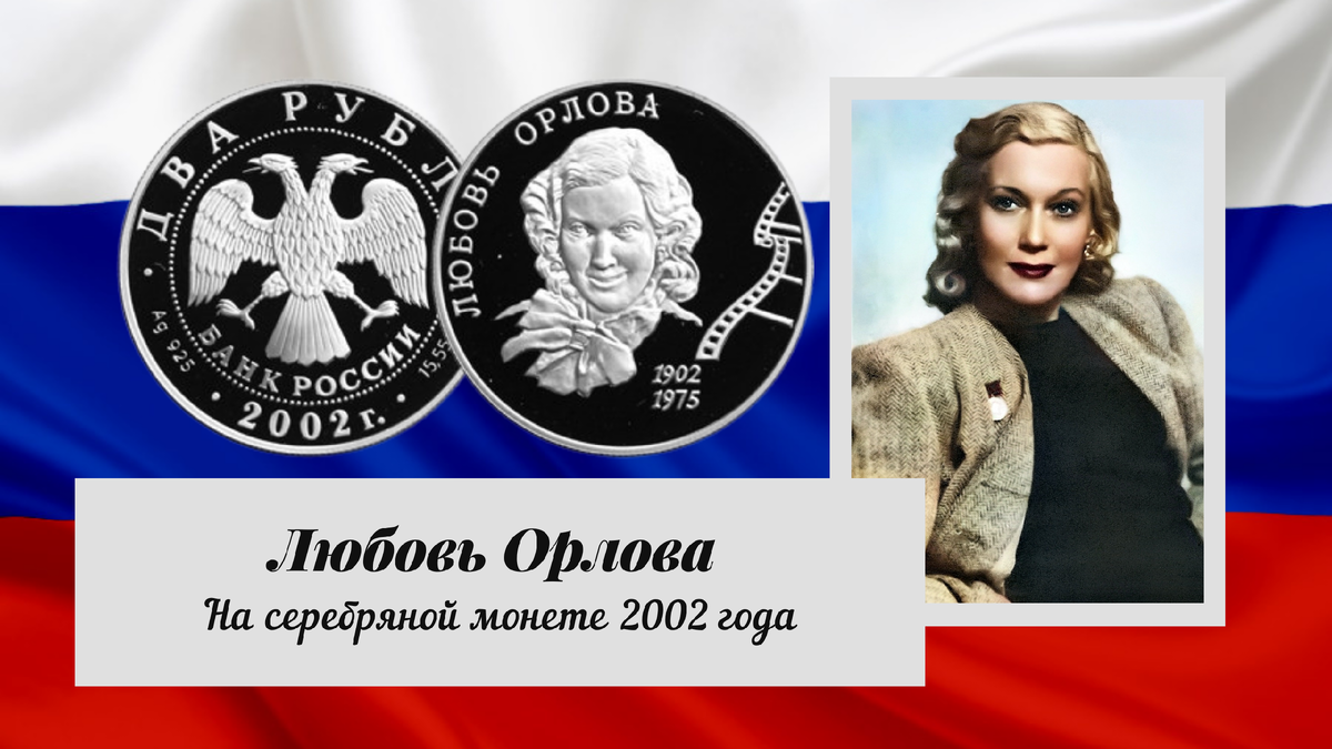 7 февраля 2002 года Банк России выпустил в обращение серебряную памятную монету номиналом 2 рубля. Монета посвящена 100-летию со дня рождения Любови Орловой. Тираж данной монеты - 10 000 экземпляров.