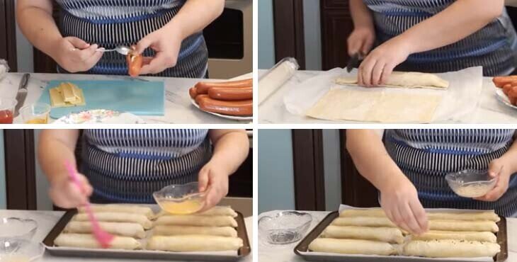 1. Разморозить слоеное тесто. Сосиску положить на тесто, завернуть, отрезать не нужную часть. Края теста хорошо зажать. Немного покатать рулет по столу, чтобы выровнять цилиндр.