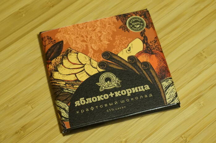 Марка MaRussia и плитка темного шоколада с яблоком и корицей.