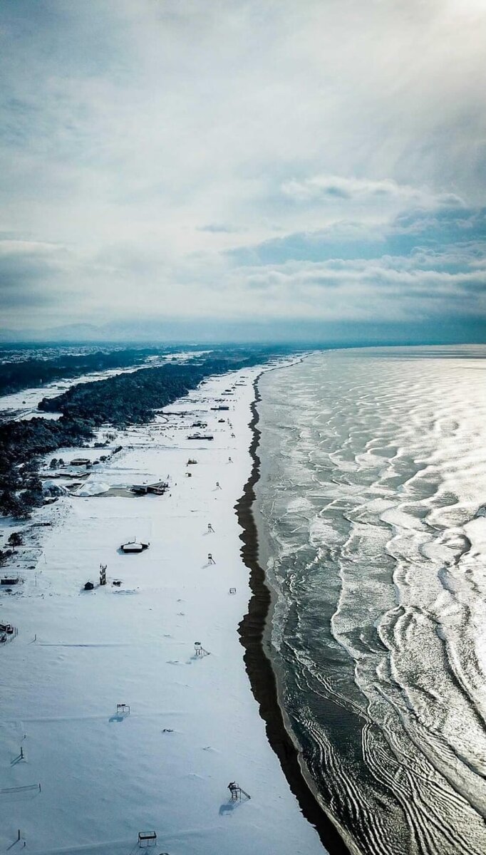 Посмотрите, как красиво выглядит ненадолго побелевшая Велика плажа (это огромный песчаный пляж длиной 11 км на юге Черногории).