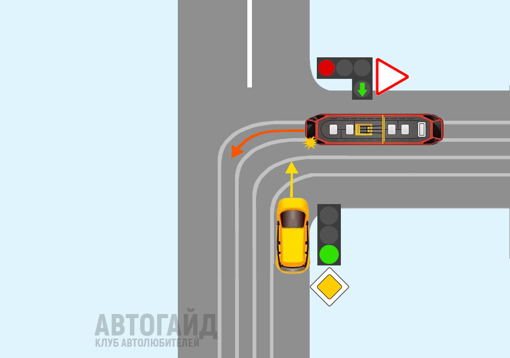 Желтая машина едет по дороге и приближается к перекрестку. Водитель хочет проехать прямо. Казалось бы, стоит светофор - горит зеленый сигнал и разрешает движение, однако справа от него приближается трамвай, который включил левый поворотник и тоже хочет проехать перекресток.