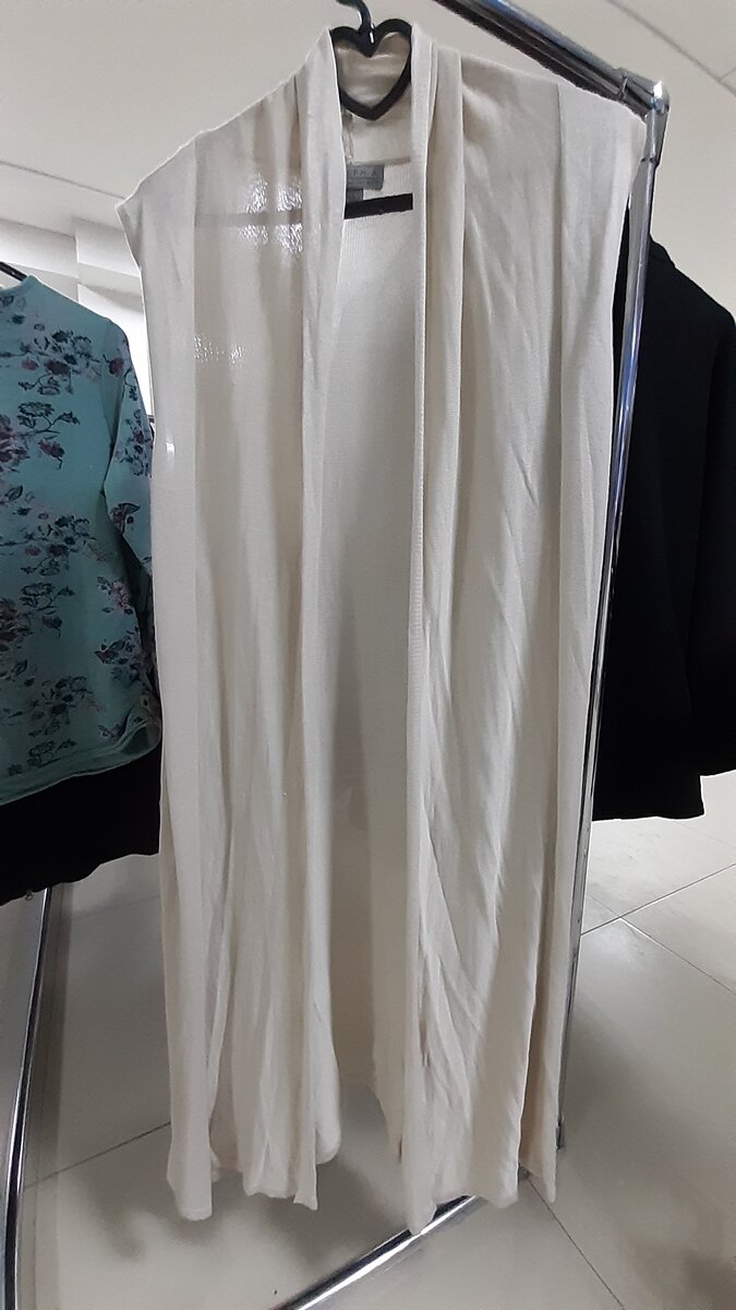 Первая вещь - длинный легкий кардиган-жилет цвета слоновой кости из вискозы (100% rayon) от бренда Josef A.