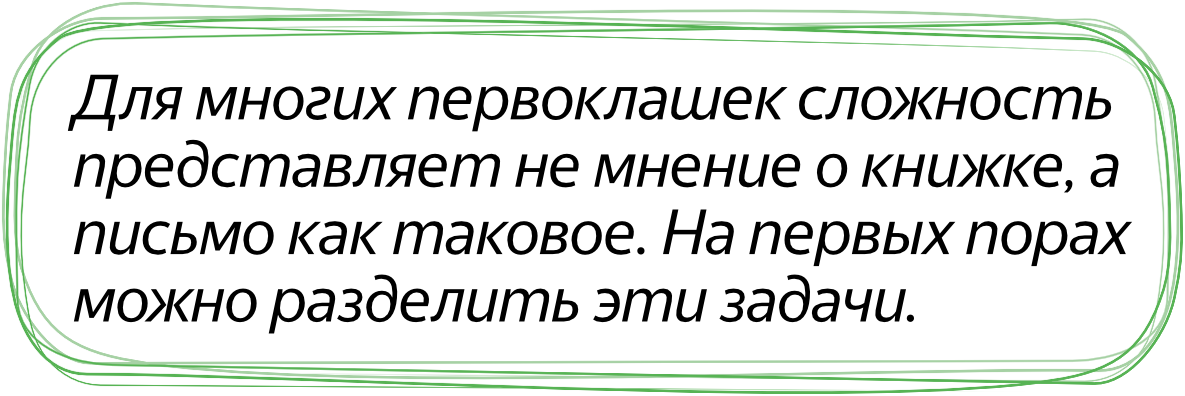 Споры с преподавателями по поводу конспектов иногда возникают у родителей первоклашек. Дети только что научились выводить буквы, с трудом собирают их во фразы, скорость их письма недостаточно высока. На то, чтобы оформить даже простые пункты, потребуется минут тридцать или сорок. Для многих сложность представляет не мнение о книжке, а письмо как таковое.