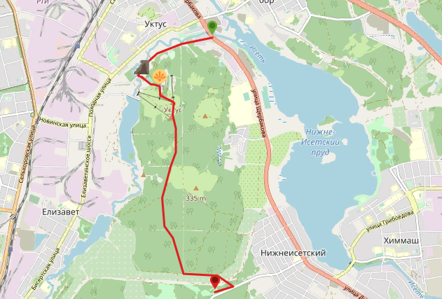 Дальше я спустился с этой горки обратно на ту же тропинку, по которой шел прежде и ожидал уже увидеть частный сектор. И увидел. Только вот по картам я находился совсем не в Нижнеисетском районе, а в районе Елизавет, то есть, вот тут: