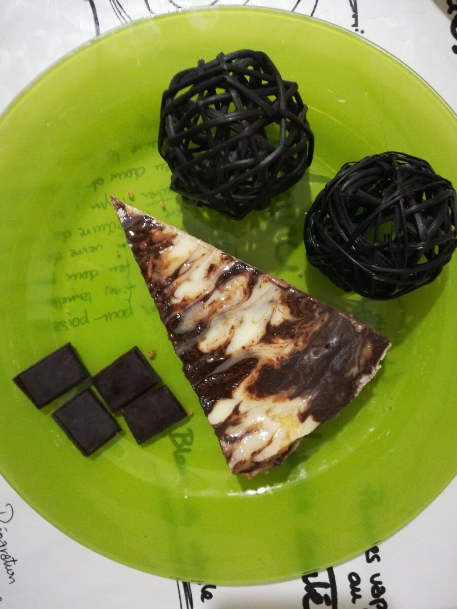 13. На горячий пирог, прямо в форме поливаем смесь из сметаны и сгущёнки, разравниваем. Затем выкладываем шоколад в несколько полос, берём зубочистку и рисуем)